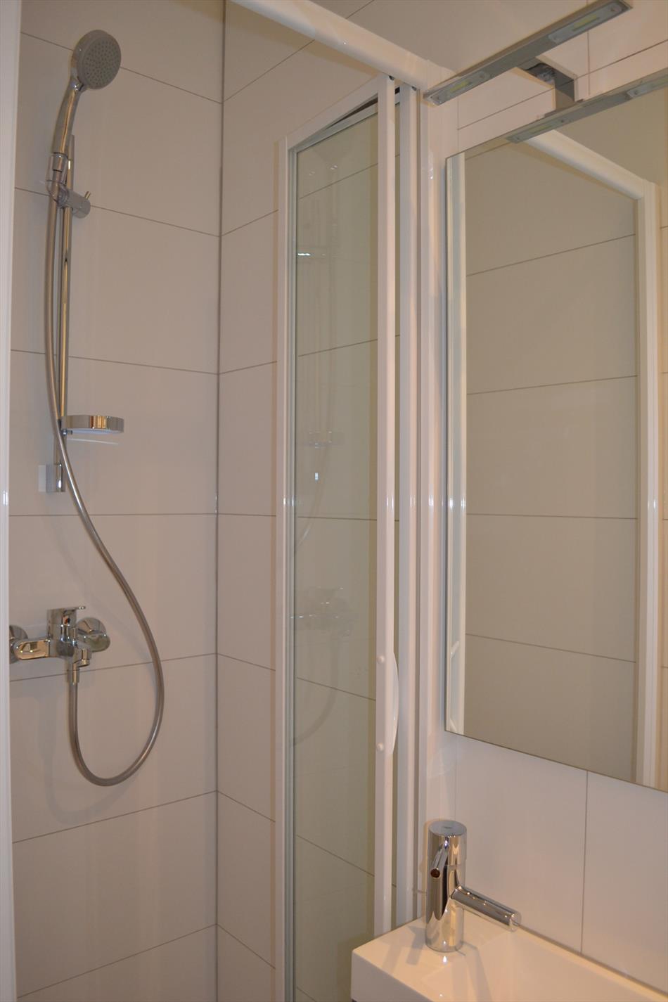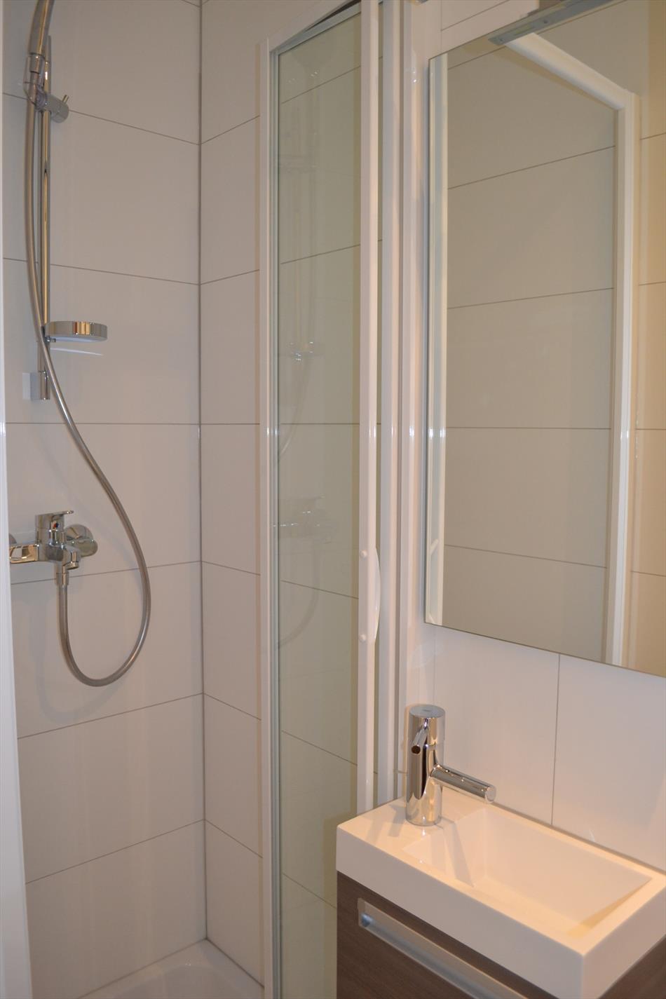 woon/slaapkamer met open ingerichte keuken, badkamer met douche.