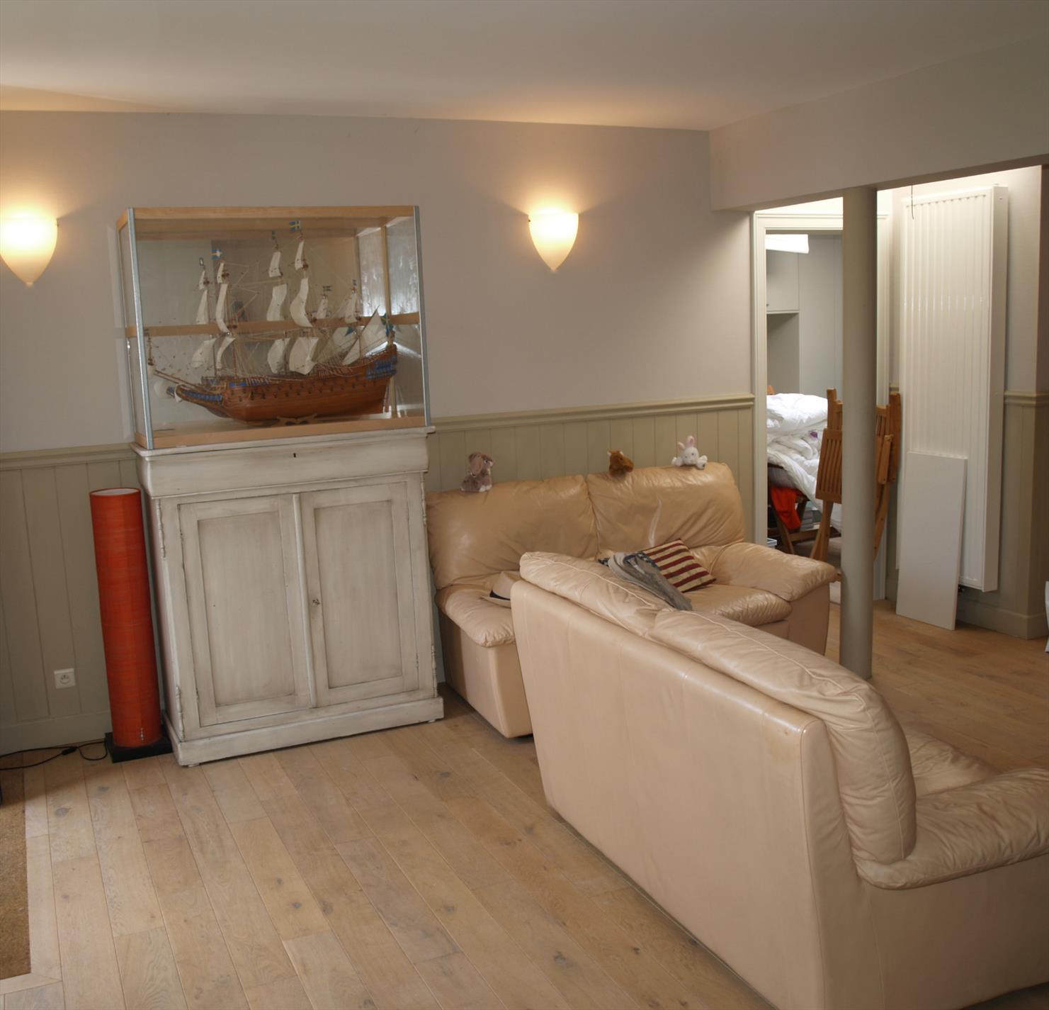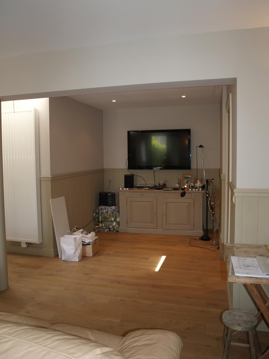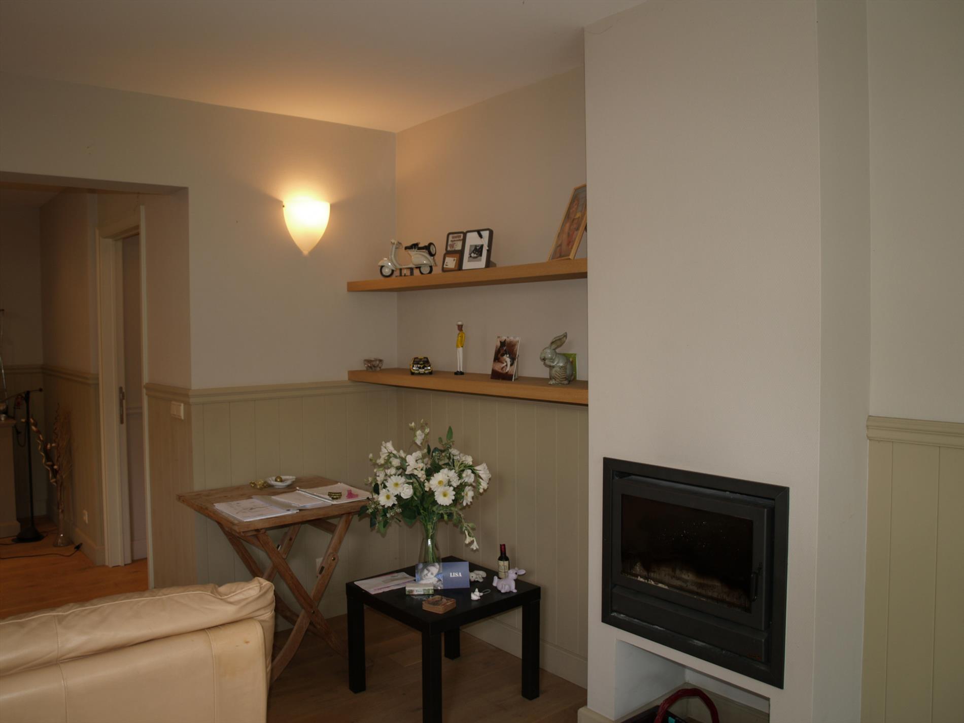 - Een gezellige woonkamer met open haard (op hout). De vloer is hier bekleed met parket.