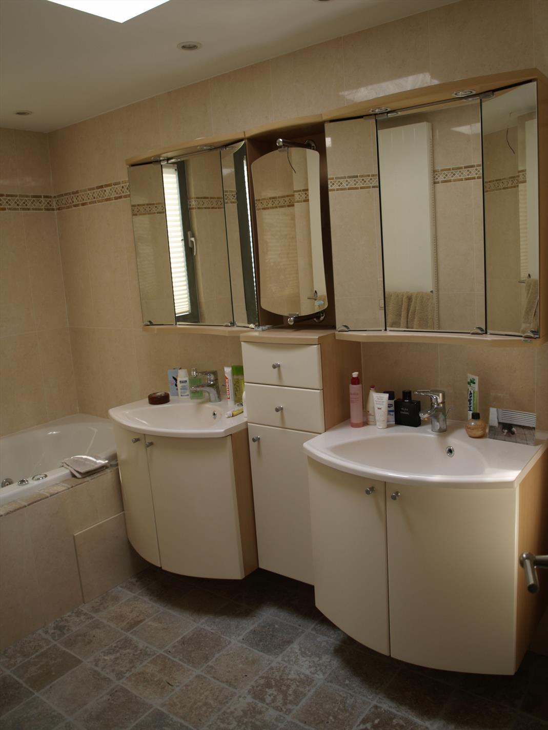 - Een luxueuze badkamer met jacuzzi-ligbad, douche, design-toilet en dubbele wastafel. De vloer is bekleed in natuursteen.