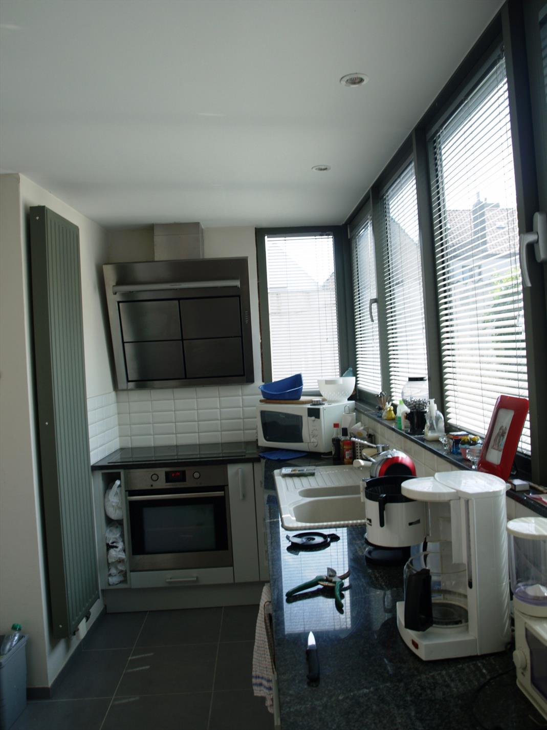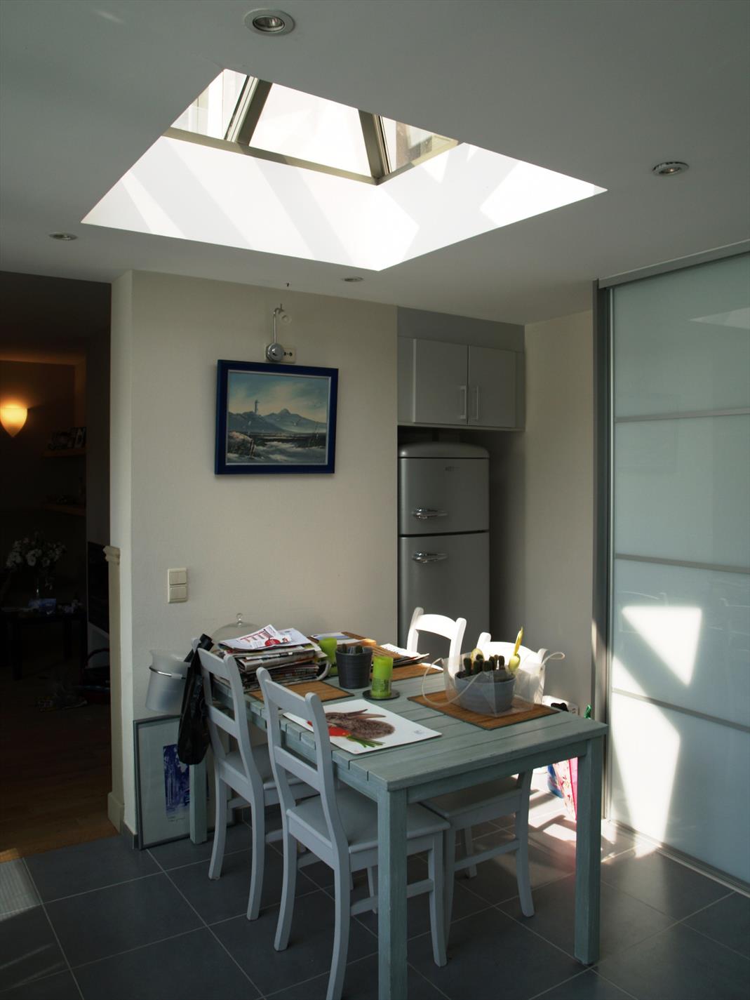 - De moderne keuken - die voorzien is van alle nodige toestellen - met een lichtkoepel.