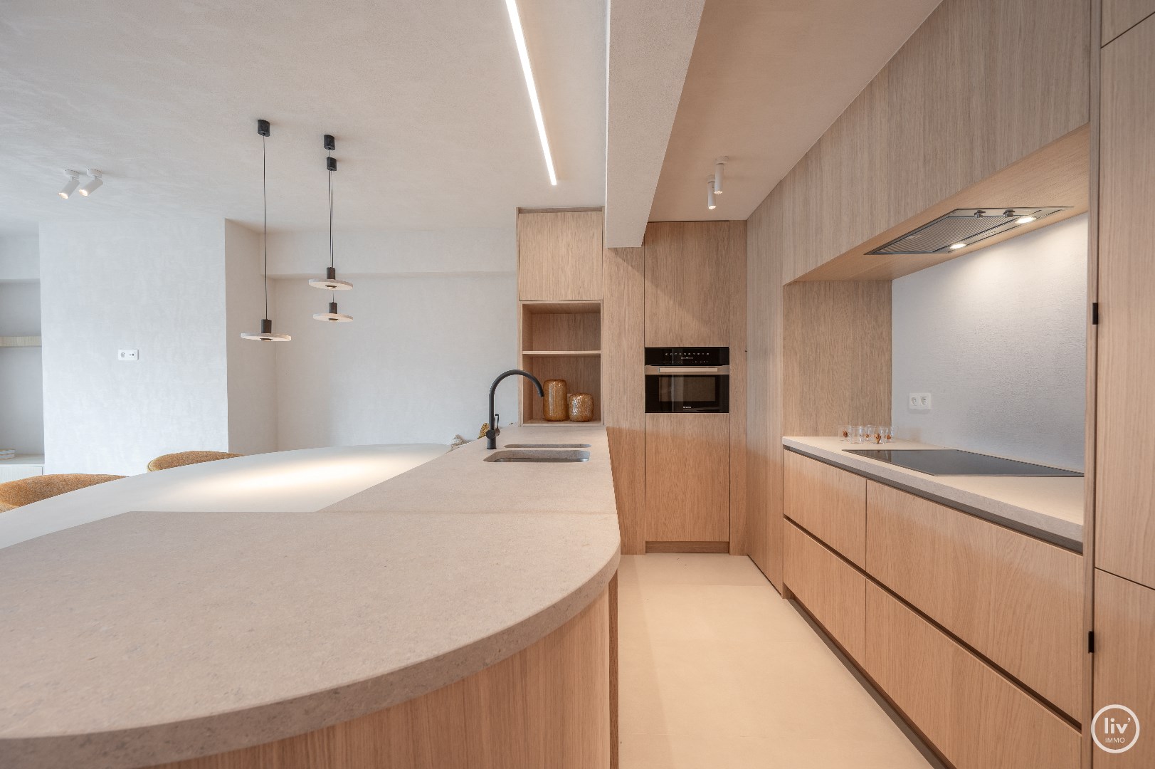 Indeling is als volgt: inkomhal met gastentoilet en vestiaire. Heel lichtrijke ruime woon- en eetkamer met ingemaakte kasten en toegang tot het zuid-gerichte terras met open uitzicht. Een moderne open keuken voorzien van alle apparatuur.