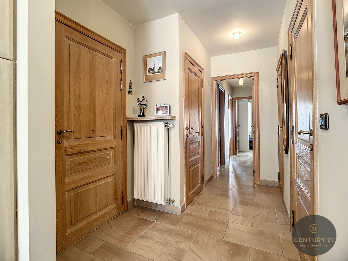 De indeling is als volgt: Inkomhal met toilet en vestiaire, een woonkamer met zijdeling zeezicht vanop het zonneterras, een open volledig ingerichte keuken. Een berging/ wasplaats, 3 slaapkamers, badkamer, aparte douchekamer en tweede terras achteraan.