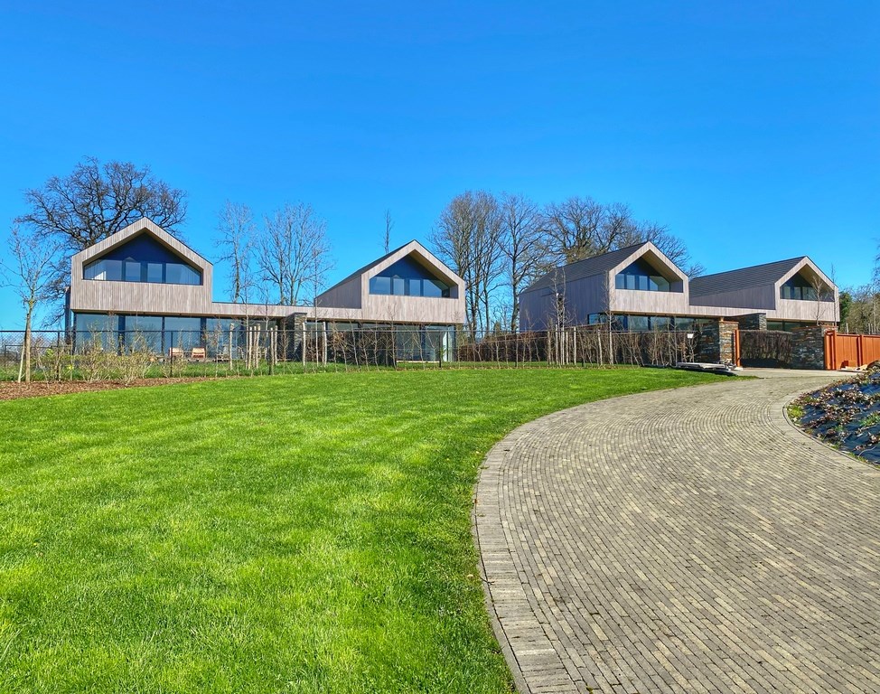 Op een mooi vlak terrein, volledig omheind en naar het zuiden gericht, weg van alle geluidshinder, staat een architecten villa van +-1500m² op 3 niveaus en 4 huizen van 200m² elk op 2 niveaus.