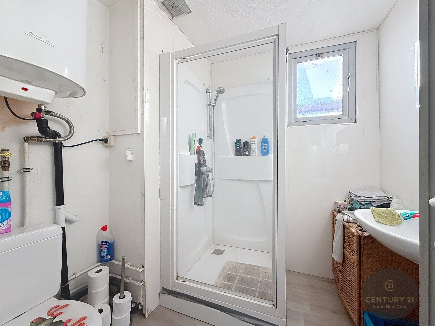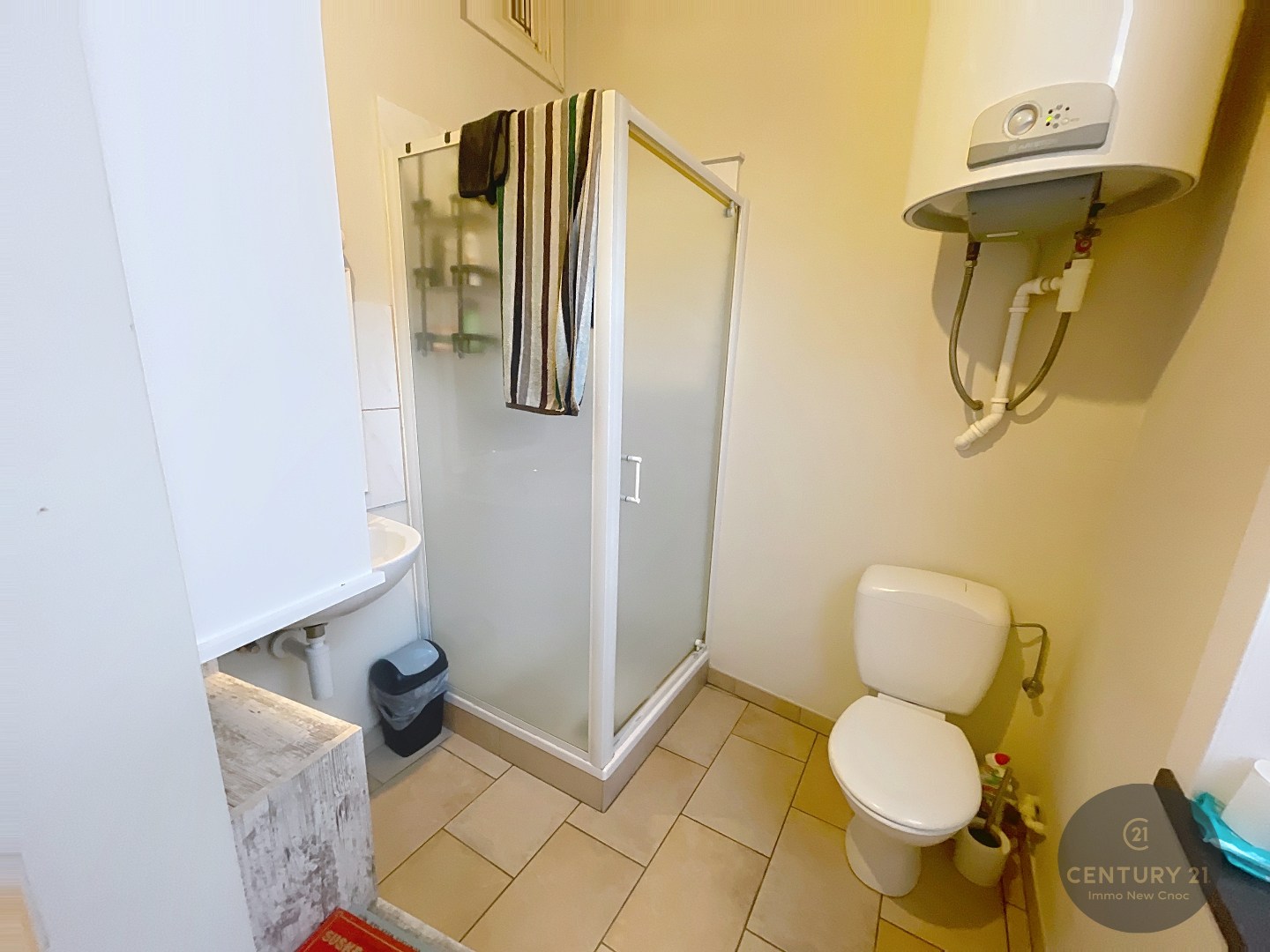 Woonkamer met open keuken, half afgesloten slaaphoek, badkamer met douche, toilet, berging en een binnenpatio.