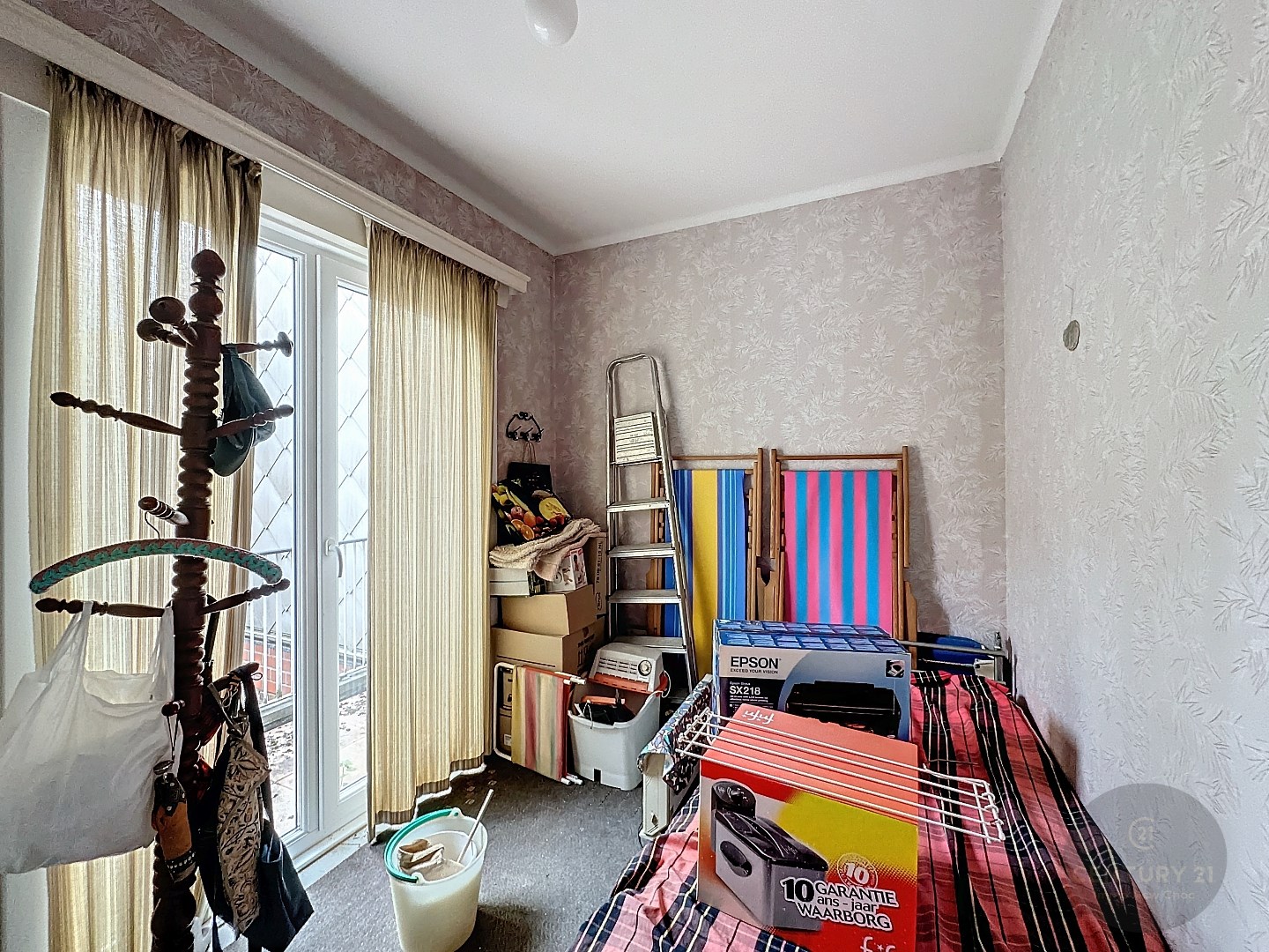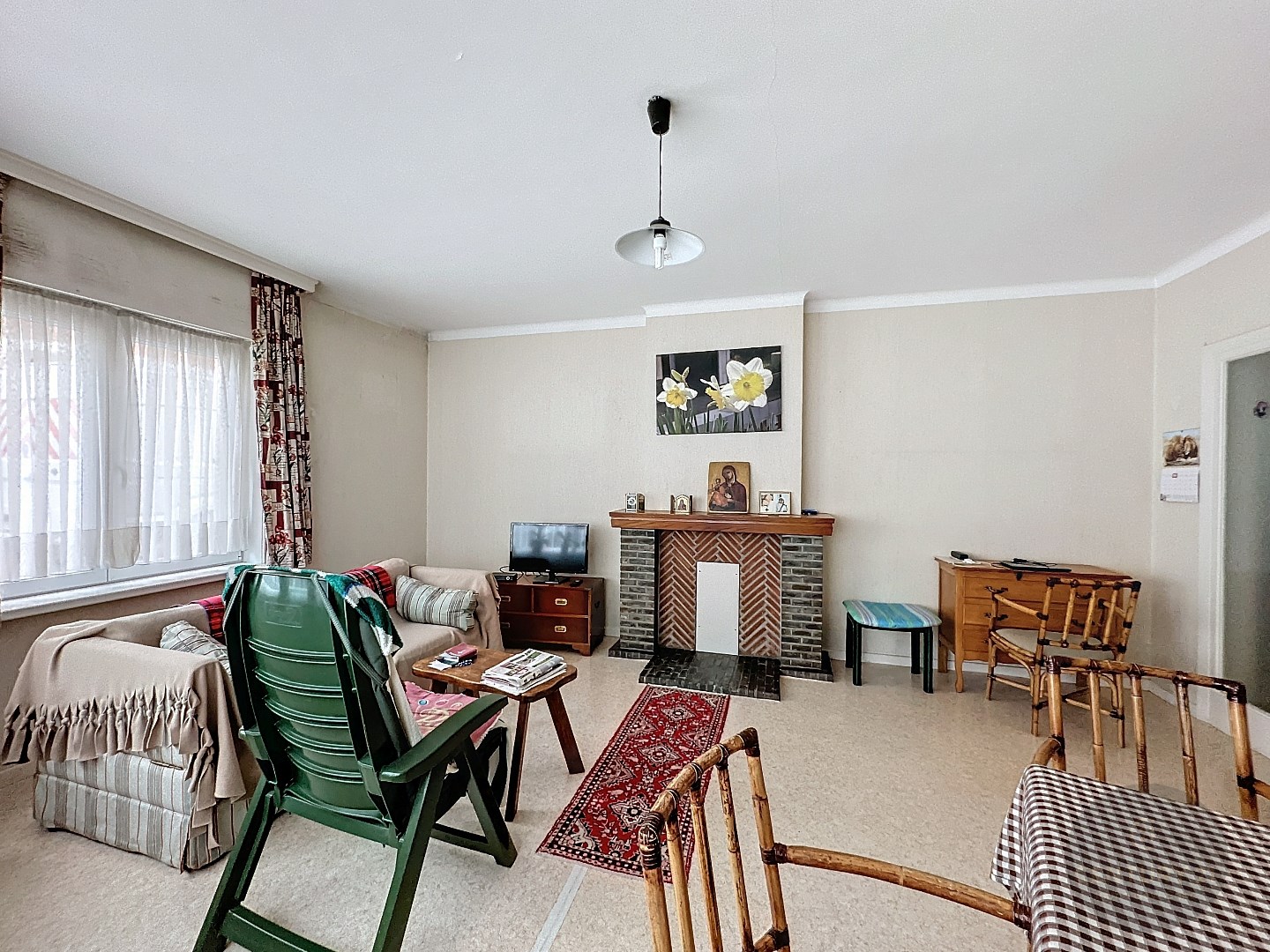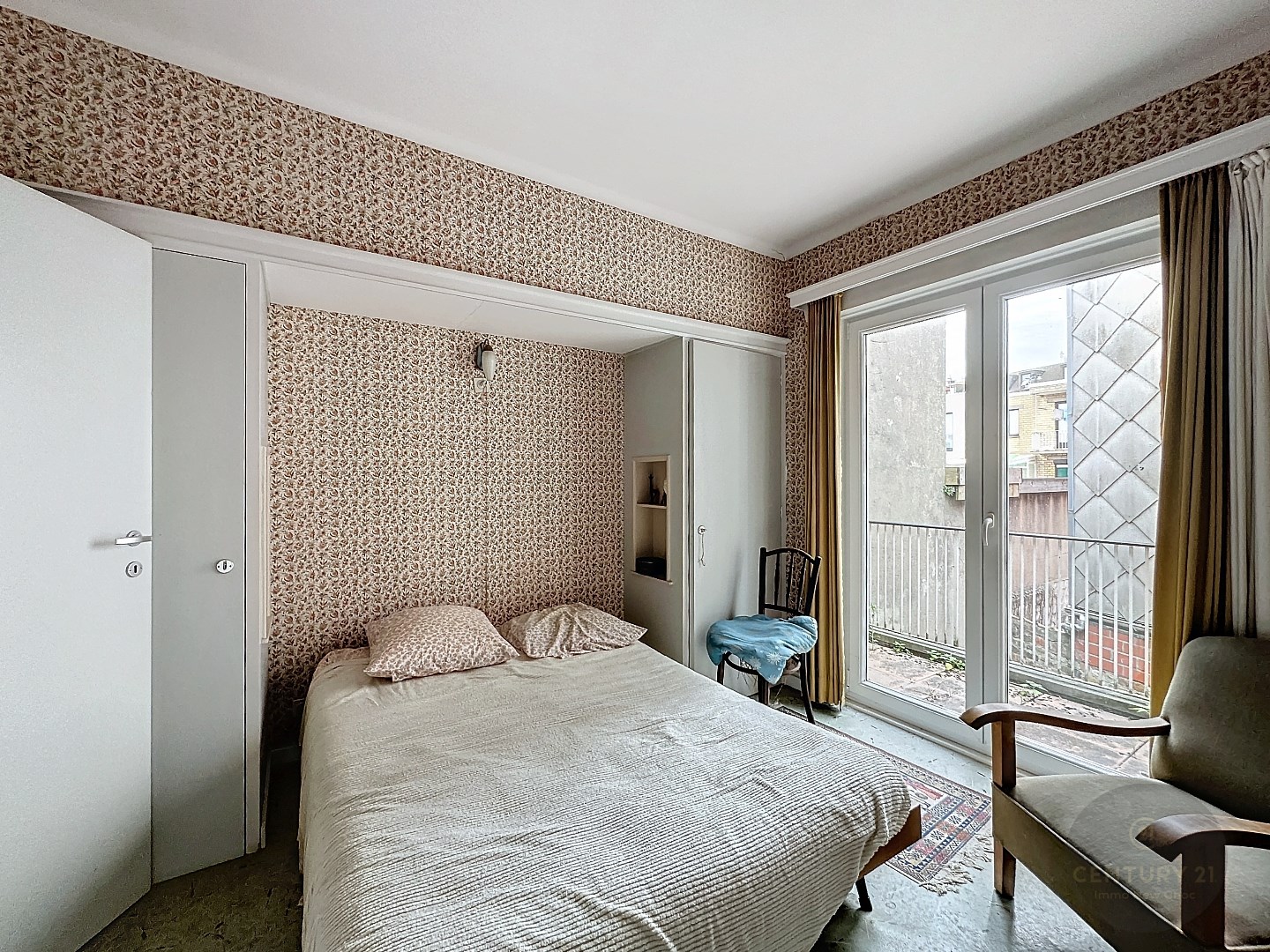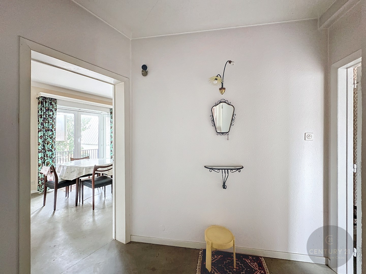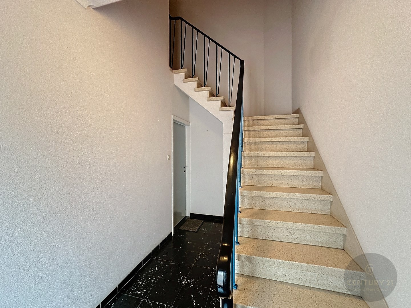 Algemene inkomhal met trap, voordeur naar gelijkvloers appartement, inkomhal, badkamer, afzonderlijke keuken, lichtrijke woonkamer, 2 slaapkamers, stadskoer.