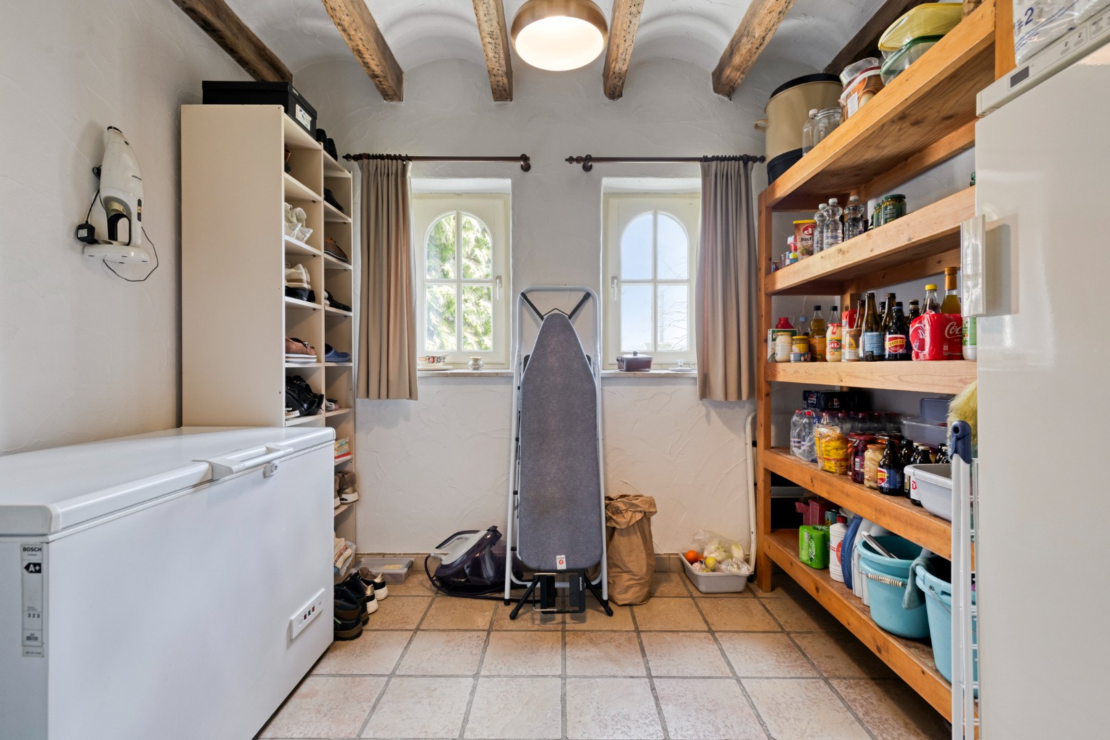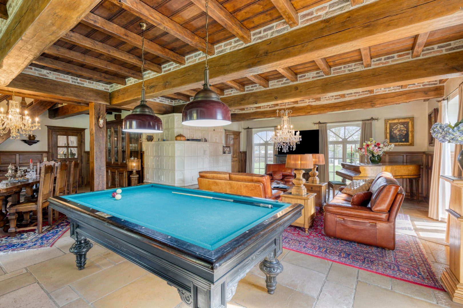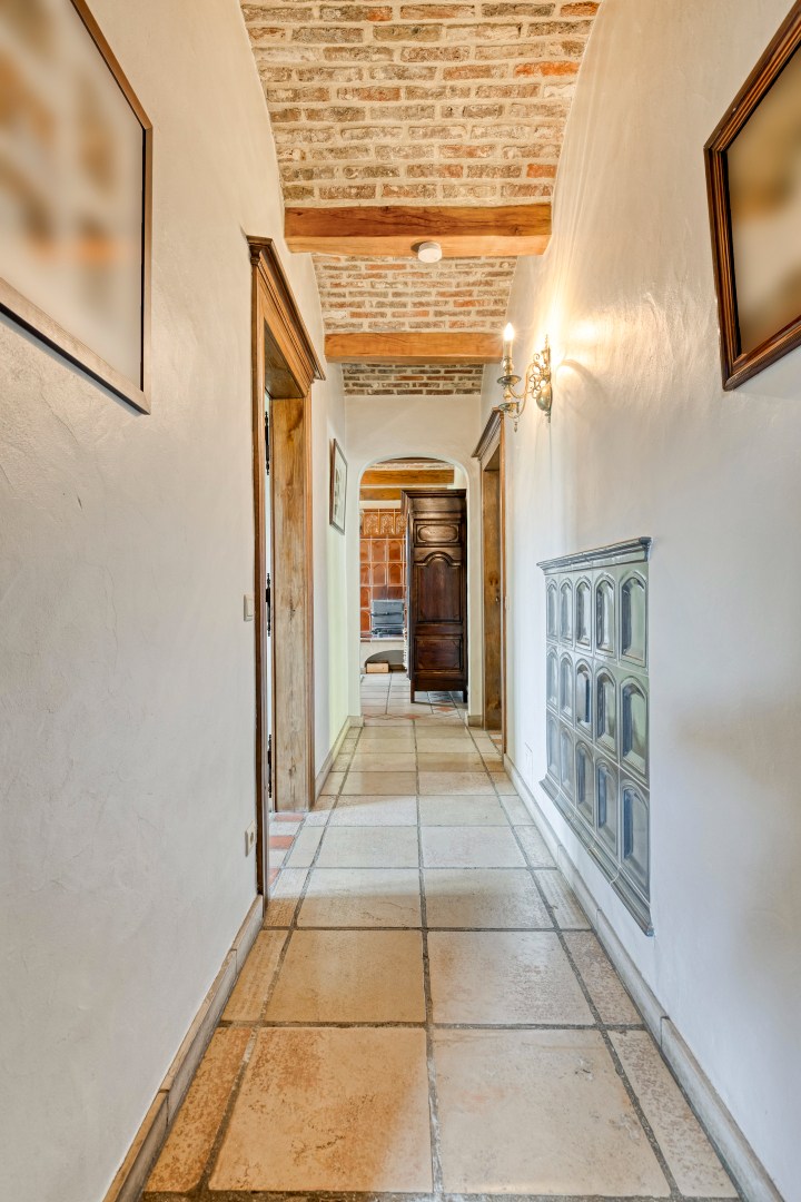 De leefkeuken vormt het kloppend hart van de woning en is uitgerust met een indrukwekkend fornuis op houtblokken, aangevuld met een elektrisch fornuis – een perfecte combinatie van traditie en hedendaags comfort. De aangrenzende eetplaats en bijzonder ruime woonkamer ademen authenticiteit, met prachtige eiken balken en stijlvolle gewelven die getuigen van een uitzonderlijk solide en duurzame bouwkwaliteit. Ook hier zorgt een tegelkachel voor extra sfeer en gezelligheid.
