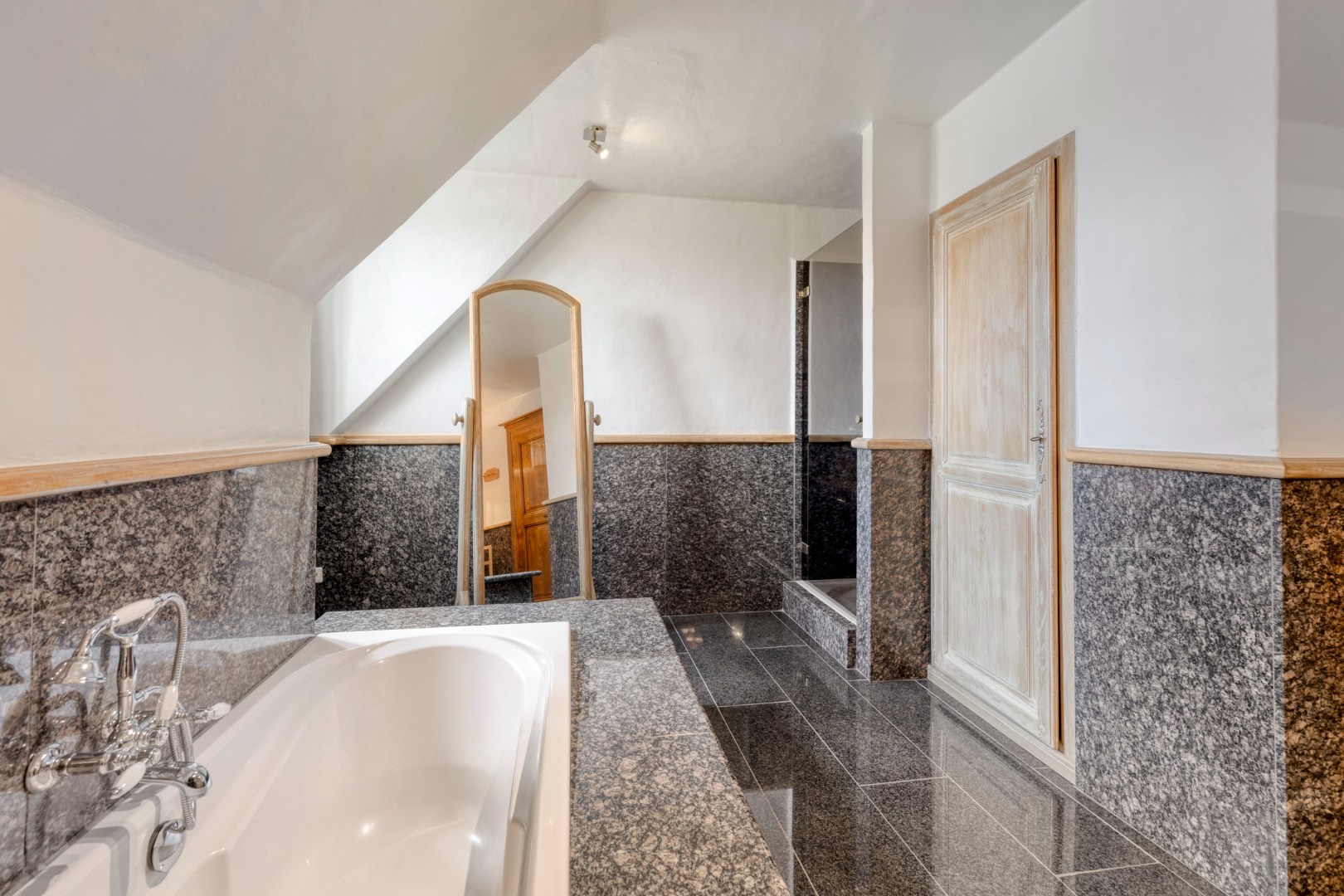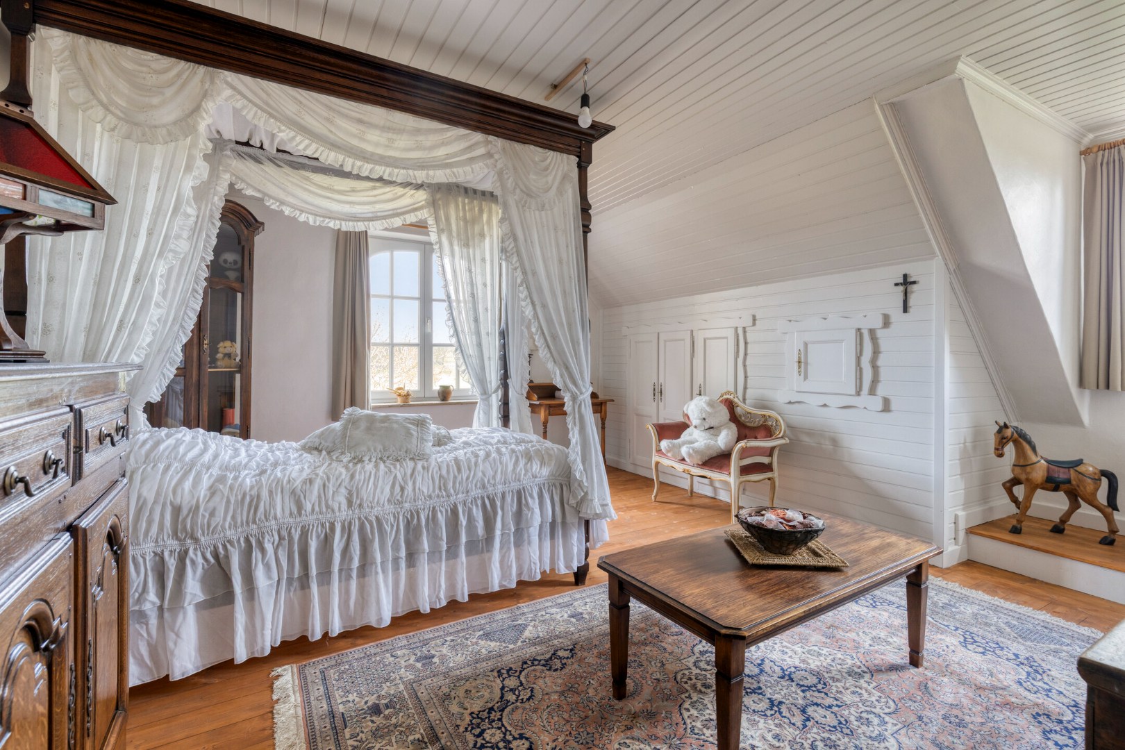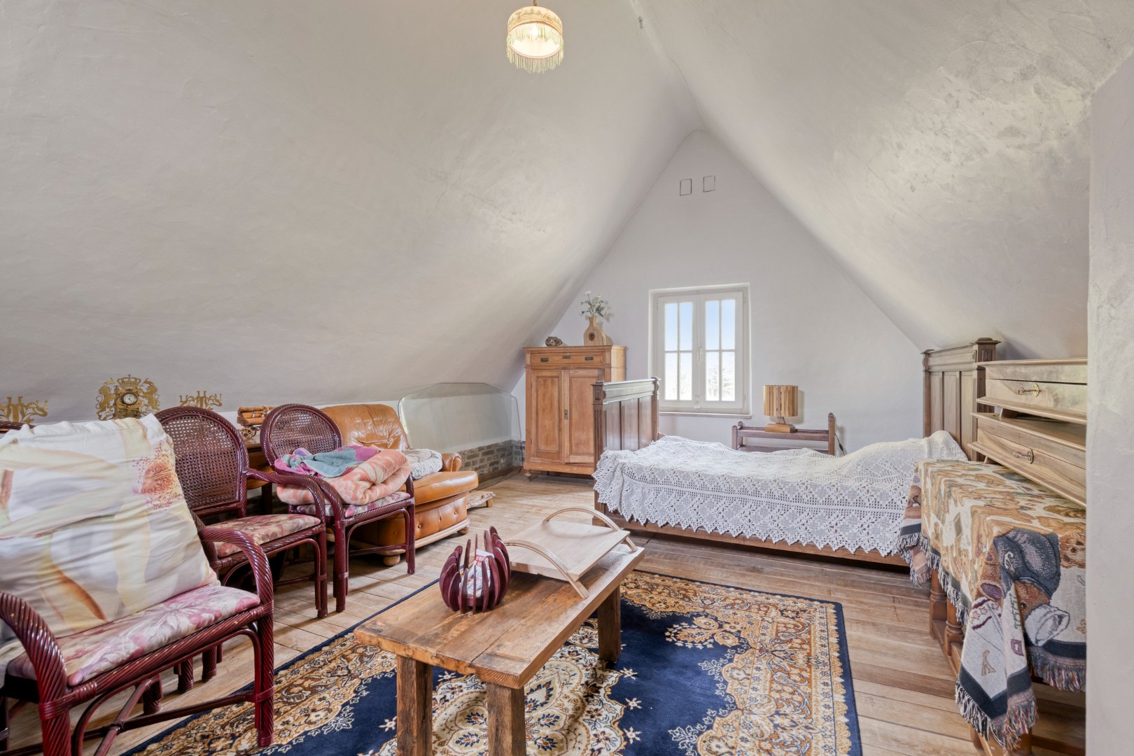 De leefkeuken vormt het kloppend hart van de woning en is uitgerust met een indrukwekkend fornuis op houtblokken, aangevuld met een elektrisch fornuis – een perfecte combinatie van traditie en hedendaags comfort. De aangrenzende eetplaats en bijzonder ruime woonkamer ademen authenticiteit, met prachtige eiken balken en stijlvolle gewelven die getuigen van een uitzonderlijk solide en duurzame bouwkwaliteit. Ook hier zorgt een tegelkachel voor extra sfeer en gezelligheid.