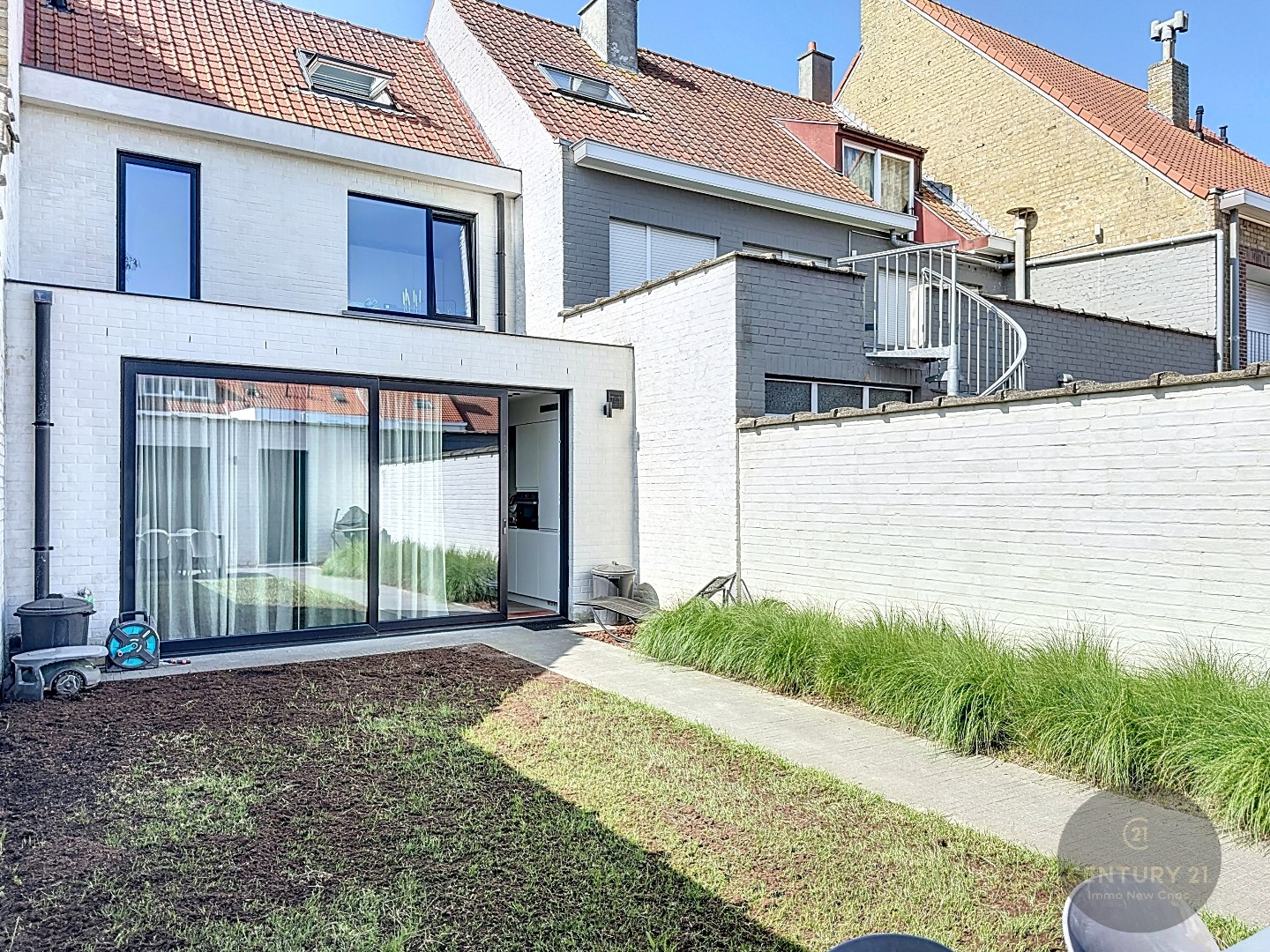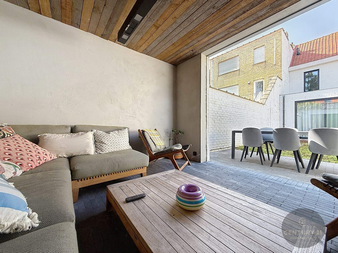 Rechtstreeks toegang via schuifraam naar de mooi aangelegde tuin met terras, ruime berging en een overdekte lounge met branders waar het winter en zomer gezellig vertoeven is!