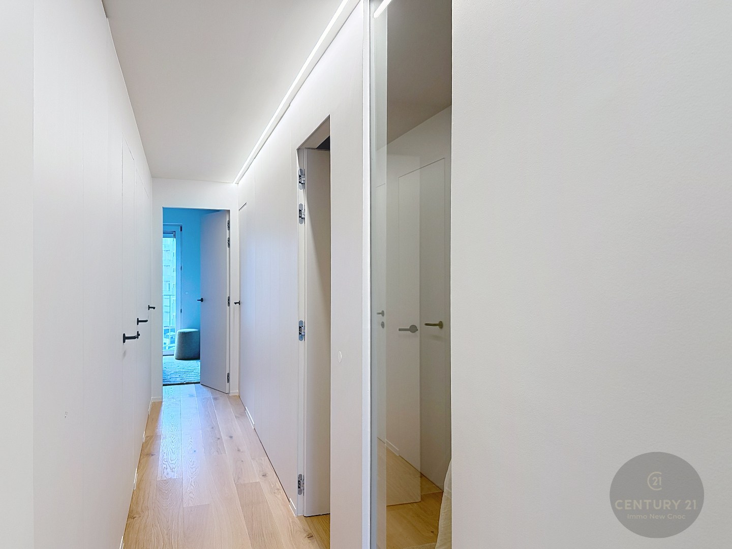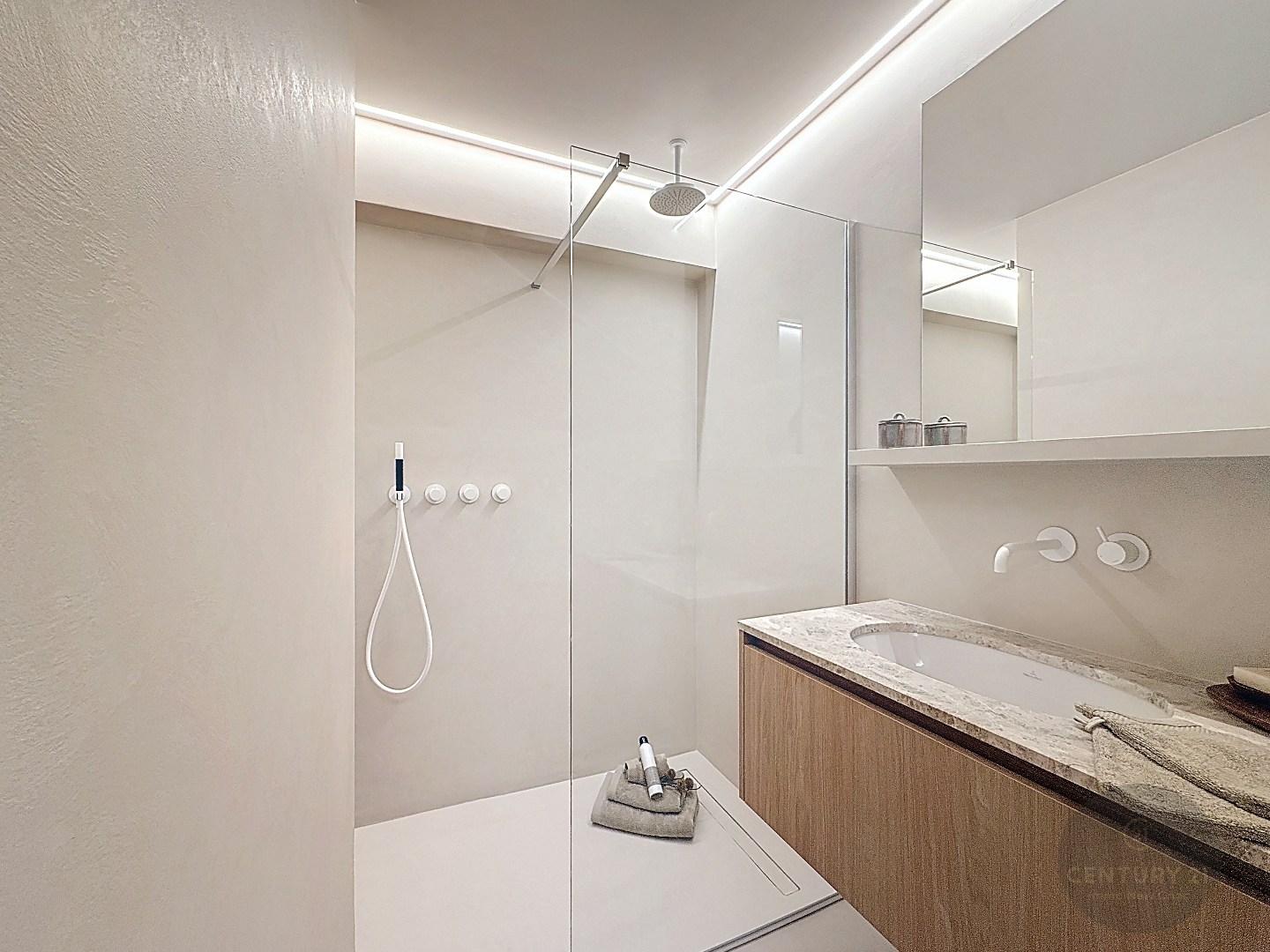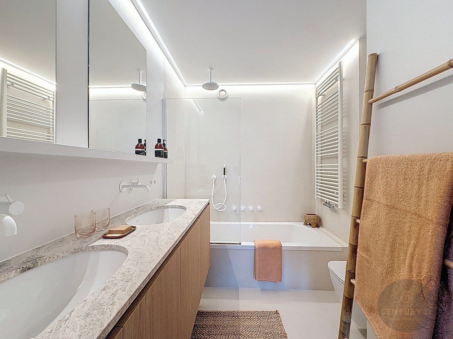 Het appartement beschikt over drie volwaardige slaapkamers, waarvan twee met een eigen badkamer, wat zorgt voor optimaal comfort en privacy. De afwerking is bijzonder smaakvol en sfeervol, met indirecte verlichting die het geheel een warme en luxueuze uitstraling geeft.