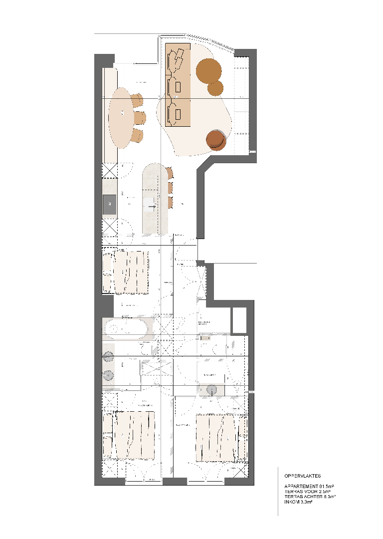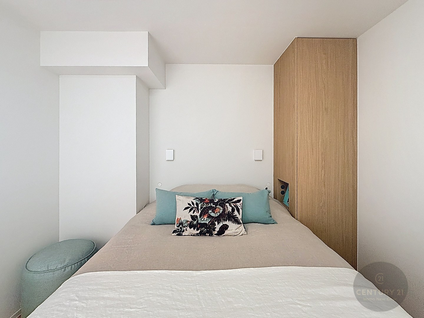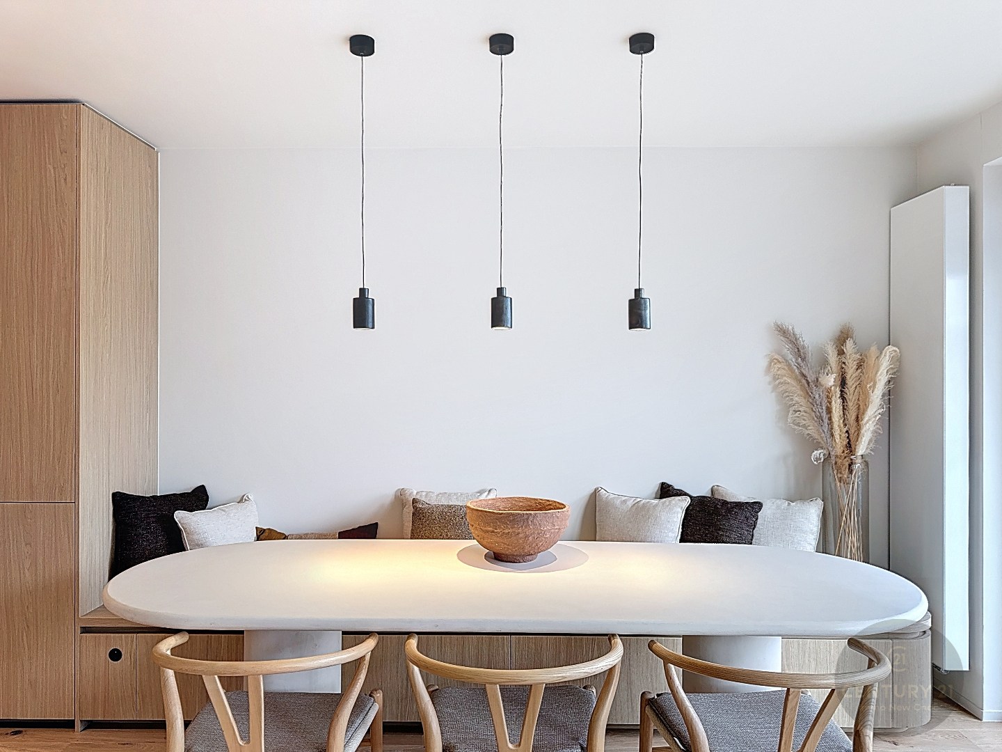 Het appartement beschikt over drie volwaardige slaapkamers, waarvan twee met een eigen badkamer, wat zorgt voor optimaal comfort en privacy. De afwerking is bijzonder smaakvol en sfeervol, met indirecte verlichting die het geheel een warme en luxueuze uitstraling geeft.